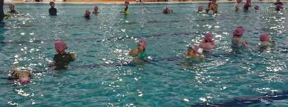 なぜ、着衣泳をするのか話を聞いたあと、水着だけのときと服を着て水に入ったときの違いを感じ、ペットボトルを浮き具がわりに使って『浮かんで待つ』ことが大切である、ということを体験しました。