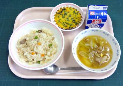 ツナピラフ、じゃがいもとコーンのスープ、千草焼き、牛乳