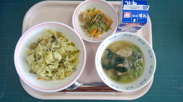 高菜チャーハン、こんにゃくサラダ、白菜と肉団子のスープ、牛乳