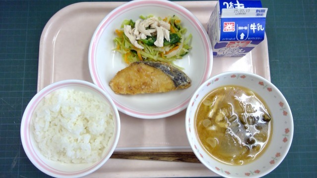 ごはん、さわらの竜田揚げ、蒸し鶏の和え物、大根とわかめのみそ汁、牛乳