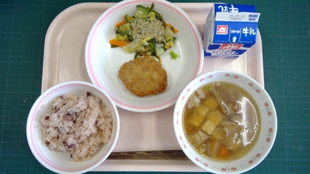 お赤飯、みそつくね、茎わかめとじゃこのサラダ、のっぺい汁、牛乳