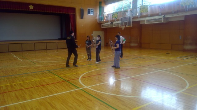 代々木警察の方を講師にお迎えして、「さすまた」や「盾」の使い方を教えていただきました。