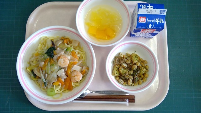 あんかけ焼きそば、野菜と大豆の青のり和え、フルーツポンチ、牛乳