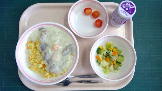シーフードクリームライス、マセドアンサラダ、さくらんぼ、牛乳