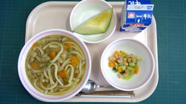 カレーうどん、揚げ豆サラダ、メロン、牛乳