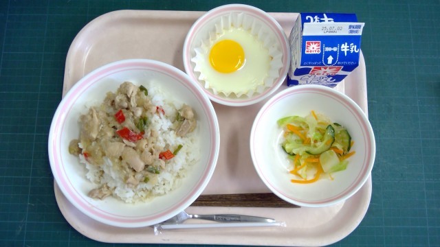 ガパオライス、目玉焼き、糸寒天サラダ、牛乳