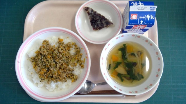 高菜そぼろ丼、かまぼこのすまし汁、水無月、牛乳