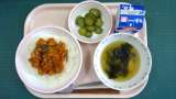 鶏肉のチリソース丼、中華風きゅうり、わかめスープ、牛乳 〈産地〉 とりにく:岩...