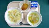 ご飯、いかとさつま芋のから揚げ、いそ和え、沢煮椀、牛乳 〈産地〉 ぶたにく、き...