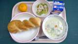 チキンライス、タラのチーズフリッター、野菜のスープ煮、牛乳 〈産地〉 たら:北...