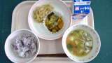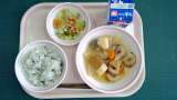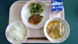 ご飯、さばのごまみそ焼き、野菜のおかか和え、のっぺい汁、牛乳 〈産地〉 さば:...