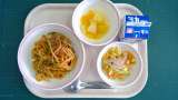 そばめし、具だくさん野菜スープ、ももゼリー 〈産地〉 ぶたにく、はくさい:茨城...