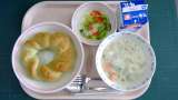 翡翠チャーハン、揚げじゃがサラダ、ワンタンスープ、牛乳 〈産地〉 とりにく:宮...