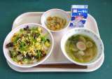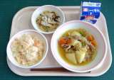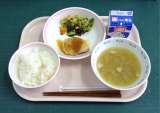ご飯、鶏肉のりんごソースかけ、海藻サラダ、オニオンスープ、牛乳 〈産地〉 とり...