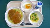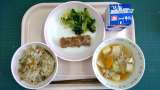 わかめご飯、揚げじゃがいものそぼろ煮、野菜のおろし和え、牛乳 〈産地〉 ぶたに...