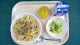 チキントマトソースペンネ、グリーンサラダ、キャロットケーキ、牛乳 〈産地〉 と...
