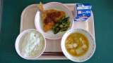 ツナピラフ、オニオンスープ、揚げじゃが芋のサラダ、牛乳 〈産地〉 たまねぎ:佐...