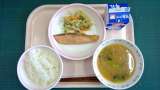 ご飯、あじフライ、いそ和え、えのきと豆腐のみそ汁、牛乳 〈産地〉 キャベツ、き...