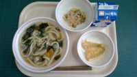 わかめうどん、きすの天ぷら、じゃが芋のみそ和え、牛乳〈産地〉とりにく:青森県きす...