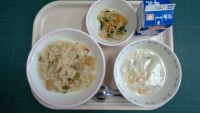 ジャンバラヤ、野菜サラダ、ミルクスープ、牛乳〈産地〉とりにく:宮崎県えび:タイた...