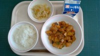 ごはん、いかのチリソースがけ、揚げ豆サラダ、わかめスープ、牛乳〈産地〉いか:ペル...