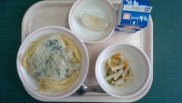 こまツナクリームパスタ、キャベツとハムのサラダ、梨、牛乳〈産地〉にんにく:青森県...