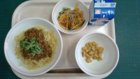 ジャージャー麺、青のりポテト、こんにゃくサラダ、牛乳〈産地〉ぶたにく:茨城県にん...