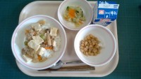 ごはん、凍り豆腐と鶏肉のチリソース、野沢菜和え、いちごミルク寒天、牛乳9月1日は...