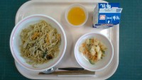 焼きそば、揚げじゃがいものみそ和え、オレンジゼリー、牛乳〈産地〉ぶたにく:埼玉県...