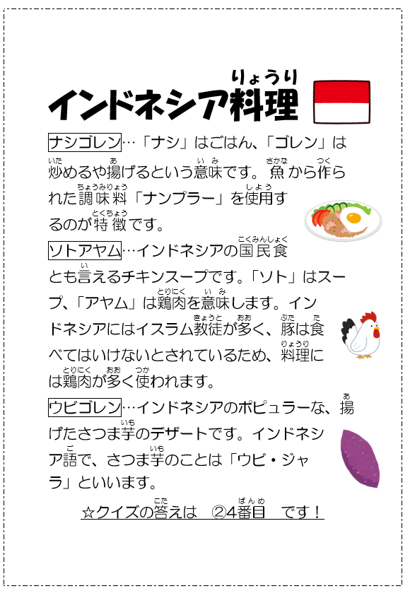令和7年9月12日(金)~インドネシア料理~ 公開日 2025/09/12 更新日 2025/09/12 今日の献立 【今日の献立】・ナシゴレン・ソトアヤム(鶏肉と春雨のスープ)・ウビゴレン・牛乳 給食