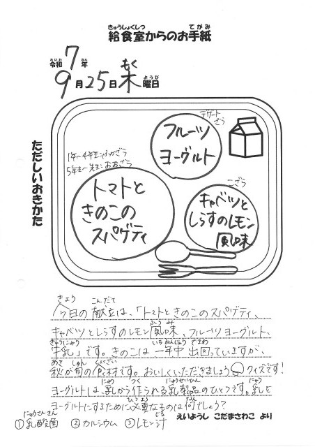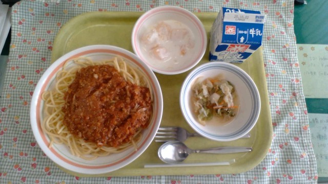 【今日の献立】令和7年9月25日(木) 公開日 2025/09/25 更新日 2025/09/25 今日の献立 【今日の献立】・トマトときのこのスパゲティ・キャベツとしらすのレモン風味・フルーツヨーグルト・牛乳 給食