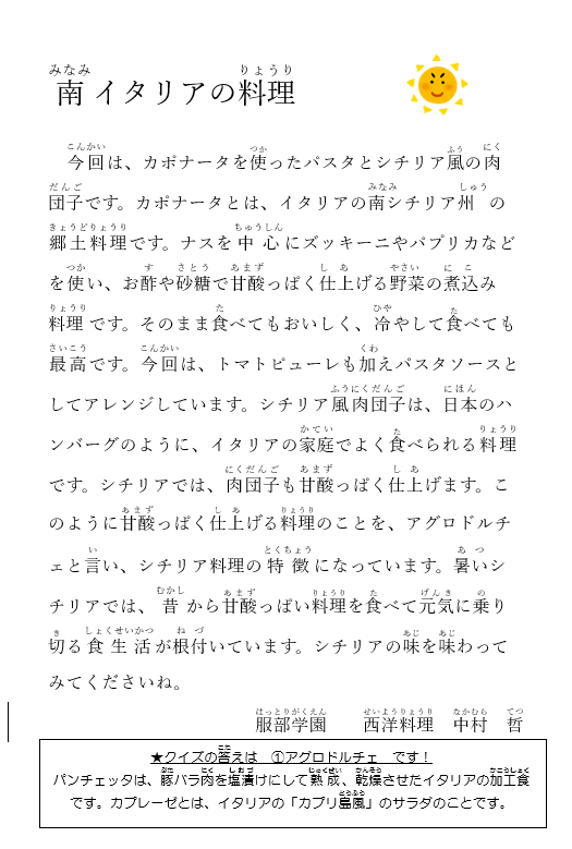 ・カポナータ風パスタとシチリア風肉団子