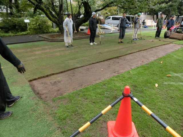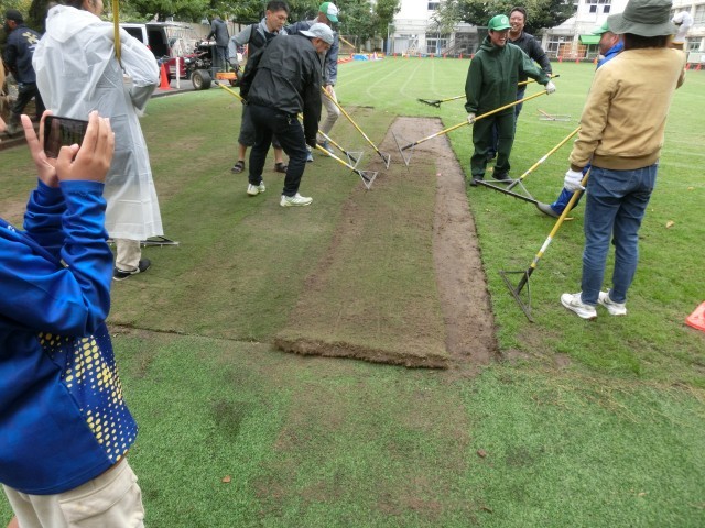 10月27日【シバッカリィーズ】国立競技場の芝生 公開日 2025/10/29 更新日 2025/10/29 校長日記 運動会が延期になった10月27日の日曜日、シバッカリィーズの方と芝生業者が、国立競技場から譲り受けた芝生の移植を行いました。そぼ降る雨の中、シバッカリィーズの方たちは、校庭の一部分の芝生移植作業を黙々と行っていました。コンディションのよい状態の芝生で運動会ができました。あらためて感謝申し上げます。