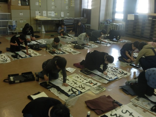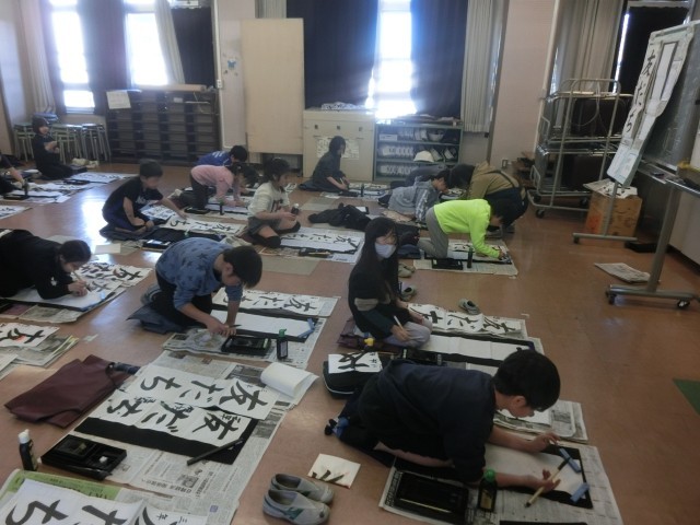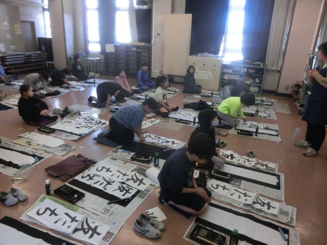 3年生の書初め練習。文字のバランスに気を付けて集中して書いていました。
