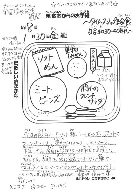 令和8年1月30日~全国学校l給食週間~タイムスリップ給食昭和30-40年代 公開日 2026/01/30 更新日 2026/01/30 今日の献立 【今日の献立】・ソフト麺・ミートビーンズ・ポテトのフレンチサラダ・果物(みかん)・牛乳・ミルメーク 給食