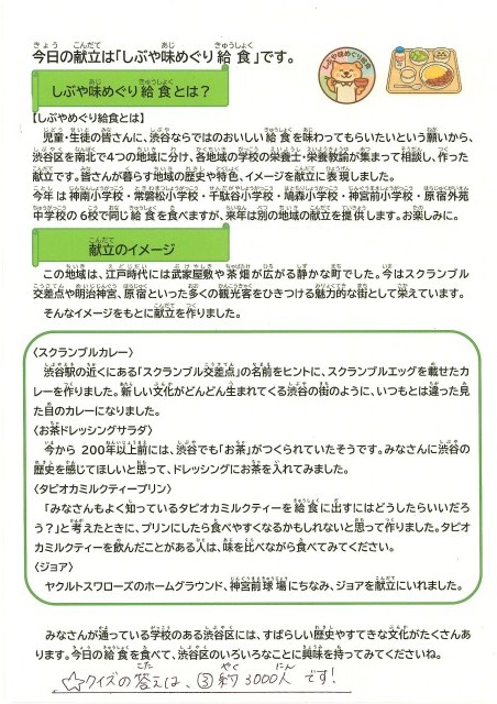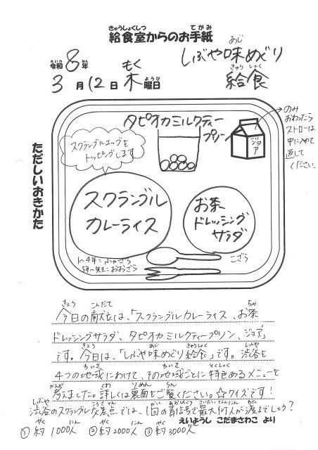 令和8年3月12日(木)~しぶや味めぐり給食~ 公開日 2026/03/12 更新日 2026/03/12 今日の献立 【今日の献立】・スクランブルカレーライス・お茶ドレッシングサラダ・タピオカミルクティープリン・牛乳 給食