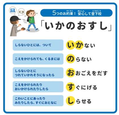 そこで、先週の安全指導日には各学級で「いかのおすし」についてお話をしました。また、夏休みに入る前に各学級で夏休みの過ごし方で、不審者の対応については、改めて、子供たちに話をする予定でおります。