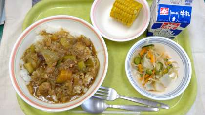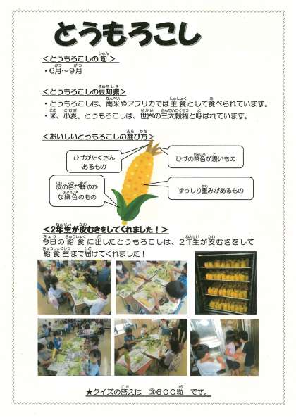 給食時間に2年生の教室に行くと、「今日のとうもろこしめっちゃおいしい!」「とうもろこし苦手だけど、今日のは頑張って全部食べた!」「これ俺がむいたやつだと思う!」等と言って、美味しそうに、また少し誇らしげに食べていました。