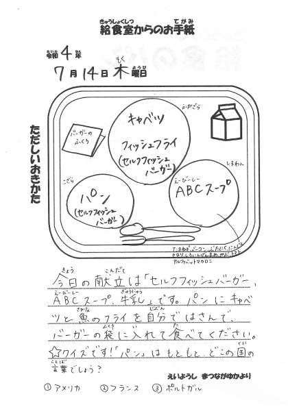 「私は全部はさんだら大きすぎてかぶりつけなくなっちゃった。」「私はパンにはさまないで上に乗せて食べるよ。」「僕は全部別々に食べる。」などなど、いろんな食べ方をしている様子でした。