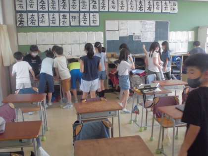 全校朝会も終わり、学校を歩いていると 最終日 各学級いろんなことをしています。
