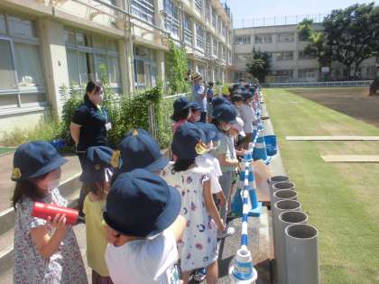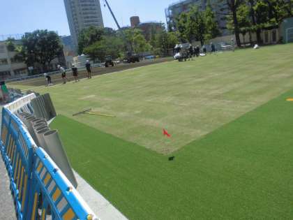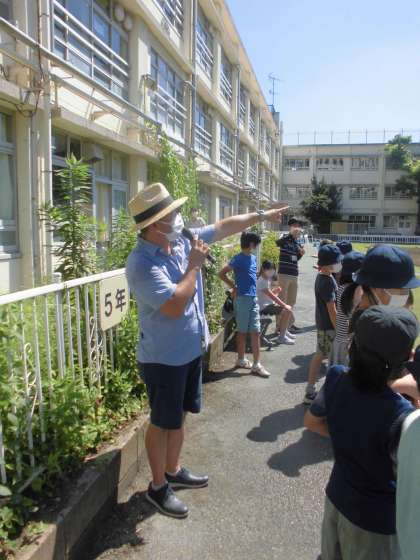 シバッカリィーズの大林さん(前本校PTA会長)が芝生敷設の説明をしてくださり、子供たち熱心に聞き入っていました。