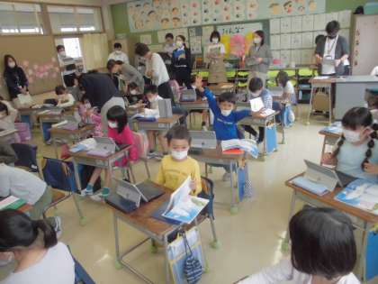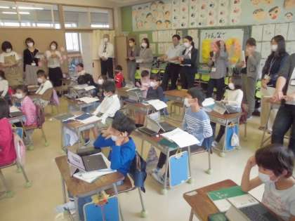 10月12日【1年生】 研究授業 公開日 2022/10/12 更新日 2022/10/12 校長日記 今日は、4時間授業でした。5時間目は、1年2組で研究授業を実施しました。 国語 くじらぐもの授業です。 タブレットを使った授業でした。