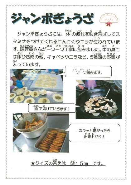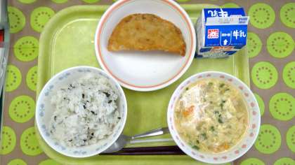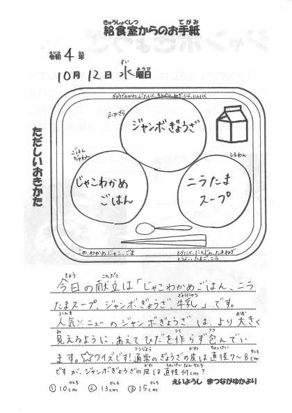 【今日の献立】10月12日(水) 公開日 2022/10/12 更新日 2022/10/12 今日の献立 今日の献立 ・じゃこわかめごはん ・ニラたまスープ ・ジャンボぎょうざ ・牛乳 今日はみんな大好きジャンボぎょうざでした。 おまけを配りに各教室を回ったのですが、どのクラスも「ぎょうざが来たぞ!!やったー!」と大歓迎でした。 残菜もとても少なく、よく食べてくれました。