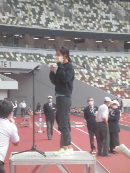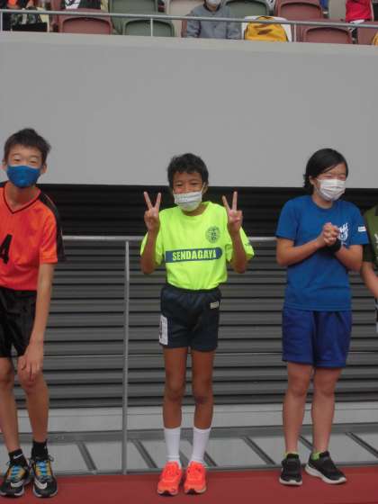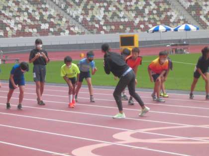 福島選手による走り方教室では、各校代表1名が福島選手と一緒に走りました。