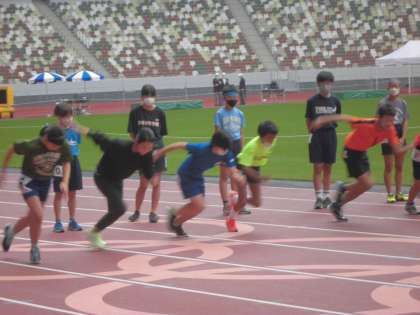 10月17日【6年生】走り方教室 公開日 2022/10/17 更新日 2022/10/17 校長日記 走り方教室の最後に実際に福島選手と子供たちが一緒に走りました。 やはり 福島選手は、速い!!! すでに現役を引退されているそうですが、 まだまだ、現役時代を彷彿とさせる走りでした。子供たちも必死で福島選手を追いかけました。 セレモニーが終わり いよいよ 競技です。
