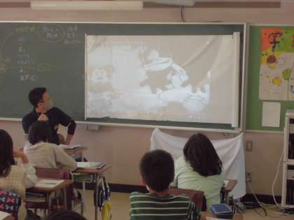 2組担任が1組の教室で社会を指導しています。