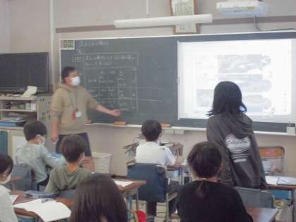 写真は、5年生で 1組担任が2組の教室で理科を指導し、