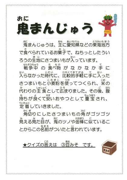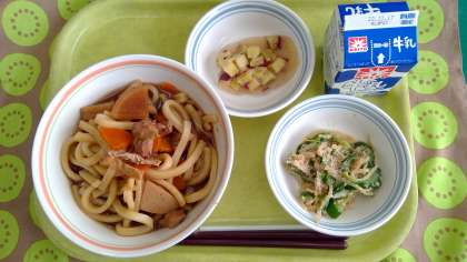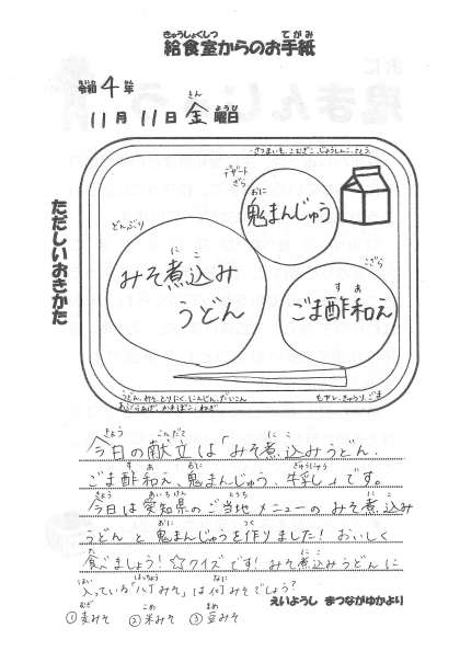 【今日の献立】11月11日(金) 公開日 2022/11/14 更新日 2022/11/14 今日の献立 今日の献立 ・みそ煮込みうどん ・ごま酢和え ・鬼まんじゅう ・牛乳 今日は愛知県のご当地メニュー「みそ煮込みうどん」と「鬼まんじゅう」を作りました。 みそ煮込みうどんは八丁味噌を使っていて色はとても濃いですが、味はお味噌のコクがありほっこりするうどんでした。