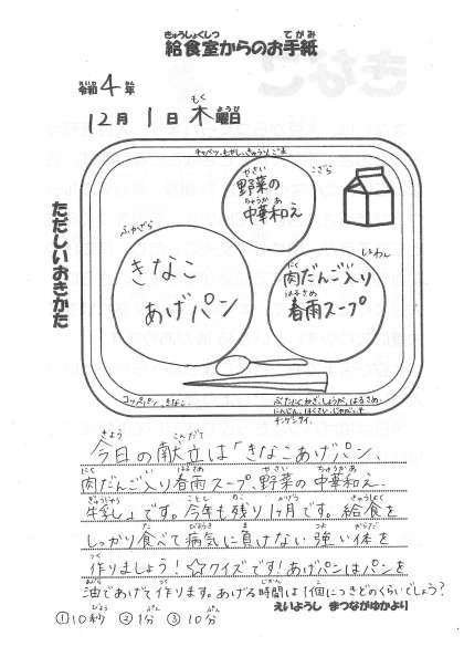今日の献立 ・きなこ揚げパン ・肉団子入り春雨スープ ・野菜の中華和え ・牛乳