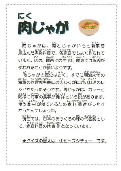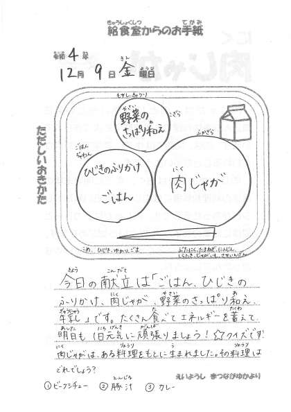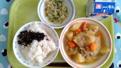 今日の献立 ・ごはん ・ひじきのふりかけ ・肉じゃが ・野菜のさっぱり和え ・牛乳